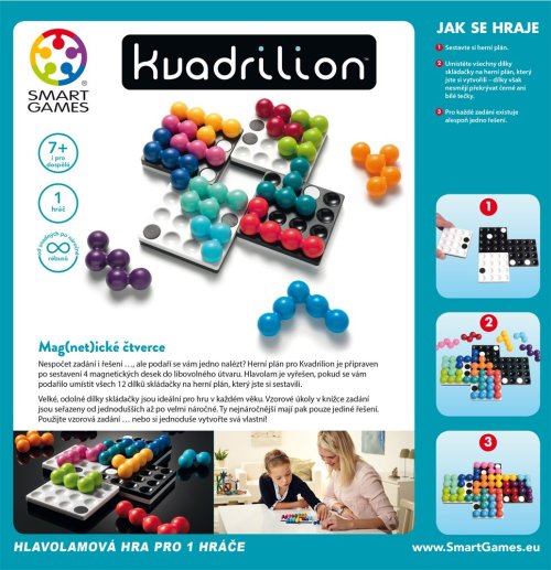 Protáhněte si mozek na logické hře s magnetickými čtverci. Nespočet zadání i řešení, ale podaří se vám jedno nalézt? Herní plán pro Kvadrilion je připraven po sestavení 4 magnetických desek do libovolného útvaru. Hlavolam je vyřešen, pokud se vám podařilo umístit všech 12 dílků skládačky na herní plán, který jste si sestavili. Velké, odolné dílky skládačky jsou ideální pro hru v každém věku. Vzorové úkoly v knížce zadání jsou seřazeny od jednodušších až po velmi náročné. Ty nejnáročnější mají pak pouze jediné řešení. Použijte vzorová zadání, nebo si jednoduše vytvořte svá vlastní! Zadání obsahuje různě obtížné úlohy. Hra Kvadrilion patří do skupiny víceúrovňových, logických her Smart games , které jsou určeny především pro jednoho hráče (nicméně hru může hrát i hráčů více). Logické hry Smart Games obsahují vždy zadání v několika různých stupních obtížnosti, rozvíjí IQ, logické myšlelní, prostorovou představivost, koncentraci a plánování. Pravidla hry: Sestavte si herní plán. Umístěte všechny dílky skládačky na herní plán, který jste si vytvořili - dílky však nesmějí překrývat černé ani bílé tečky. Pro každé zadání existuje alespoň jedno řešení. Hra obsahuje: 4 magnetické čtverce, 12 velkých barevných dílků skládačky, knížka zadání