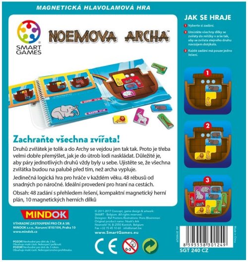 Druhů zvířátek je tolik a do Archy se vejdou jen tak tak. Proto je třeba velmi dobře přemýšlet, jak je do útrob lodi naskládat. Důležité je, aby páry jednotlivých druhů vždy byly u sebe. Ujistěte se, že všechna zvířátka budou na palubě před tím, než archa vypluje. Hra Noemova archa patří do skupiny víceúrovňových, logických her Smart games , které jsou určeny především pro jednoho hráče (nicméně hru může hrát i hráčů více). Logické hry Smart Games obsahují vždy zadání v několika různých stupních obtížnosti, rozvíjí IQ, logické myšlelní, prostorovou představivost, koncentraci a plánování.