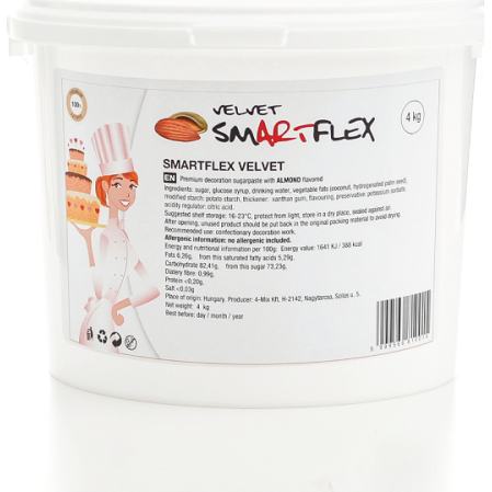 Potahovací a modelovací hmota bílé barvy s příchutí mandlí, vhodná na potahování dortu i modelování velkých dekorací. Hmotnost 4 kg.