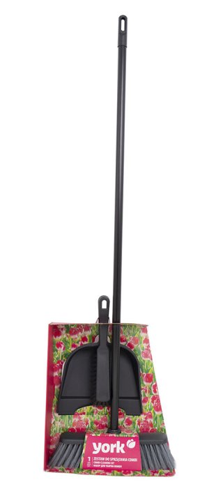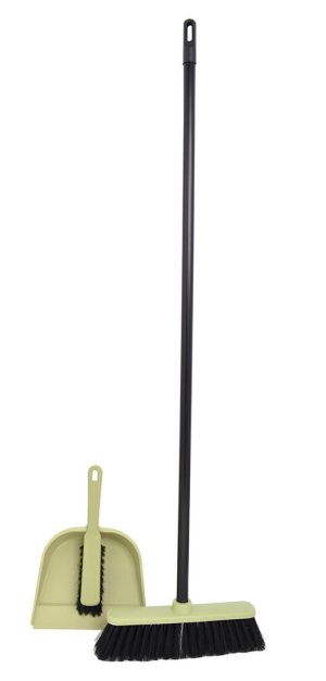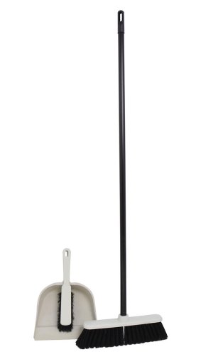 Úklidová souprava obsahuje lopatku se smetáčkem a smeták s dlouhou holí.