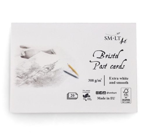 Pohlednice Bristol jsou vyrobeny z extra bílého a hladkého papíru Bristol (308 g/m2). Má zadní potisk, takže si můžete vytvořit kresbu a poslat ji poštou jako pohlednici své rodině a přátelům. Rozměr: 150 x 105 mm, 20 kartiček na jeden výrobek. Karty jsou na delším okraji slepené. Papír neobsahuje kyseliny. Výrobek má certifikát FSC.