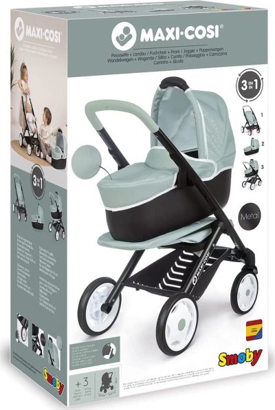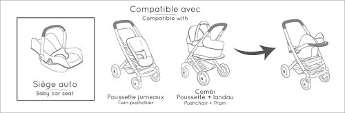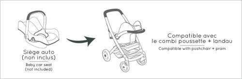 Kombinovaný kočárek pro panenky do velikosti 42 cm. S odnímatelným košíkem. Nasazením korbičky získáte kočárek hluboký nebo lze kočárek používat jen jako sportovní. Korbičku lze použít také samostatně. Kolečka s protihlukovou vrstvou, průměr 15,5 cm a 12,5 cm. Přední kolečka jsou otočná. Potahy z robustní plastové tkaniny lze očistit vlhkým hadříkem. K domácímu i venkovnímu použití.