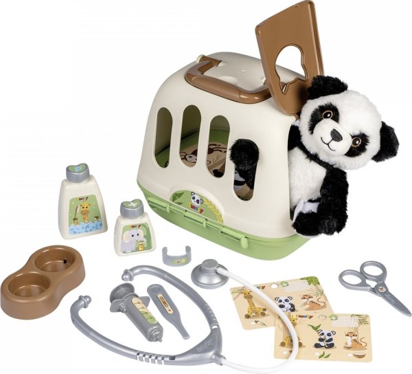 Sada obsahuje: kufřík s boxem, plyšovou pandu, misku, injekční stříkačku, teploměr, náramek, obvaz, nůžky, lahvičky a stetoskop.