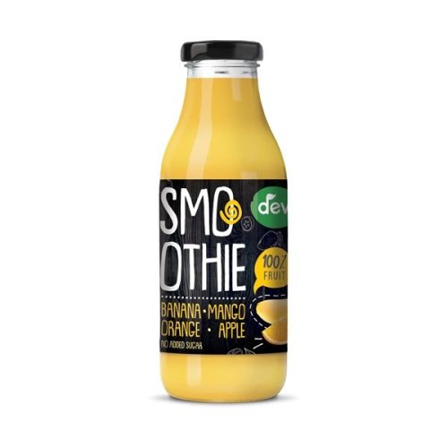 Ovocné smoothie DEVA vyrobené z kvalitního ovoce (banán, mango, pomeranč, jablko), bez přidaného cukru a s přidaným vitamínem C, vhodné jako lahodná svačina