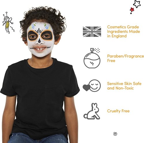 vhodné pro profesionální použití ideální na oslavy, karnevaly, den dětí, halloween dlouhotrvající, jasné a syté barvy jednoduchá aplikace - štětcem nebo houbičkou (není součástí balení) bezpečné a netoxické, vhodné i pro citlivou kůži lehce odstranitelné - omyvatelné vodou a mýdlem