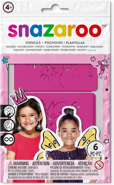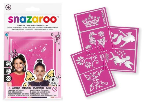 tematicky zaměřené na princezny, motýly, víly skvělý doplněk pro malování na obličej a tělo samolepicí podklad udrží šablonu na místě pružný materiál se snadno přizpůsobí křivkám obličeje nebo rukou opakovaně použitelné a omyvatelné ideální pro použití s barvami na obličej a tělo Snazaroo