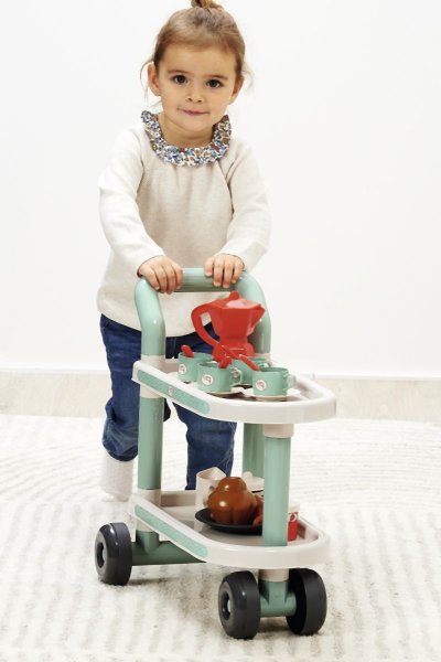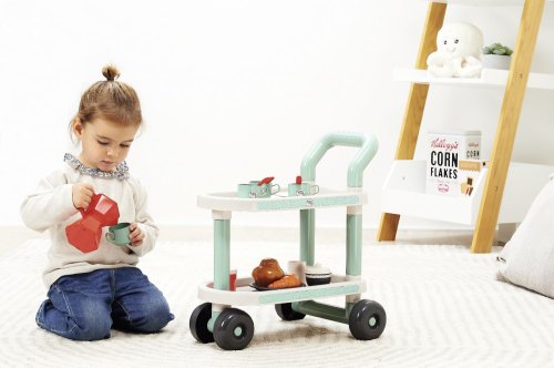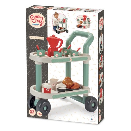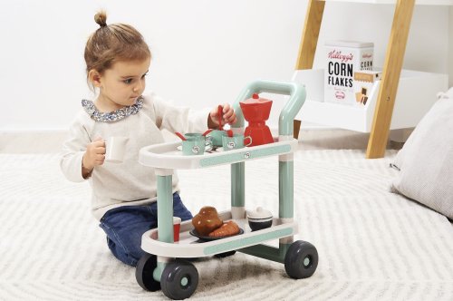 Snídaňový vozík na kolečkách s kávou i zákuskem, celkem 22 ks příslušenství. Rozměry vozíku (DxŠxV): 44 x 50 x 45,5 cm.