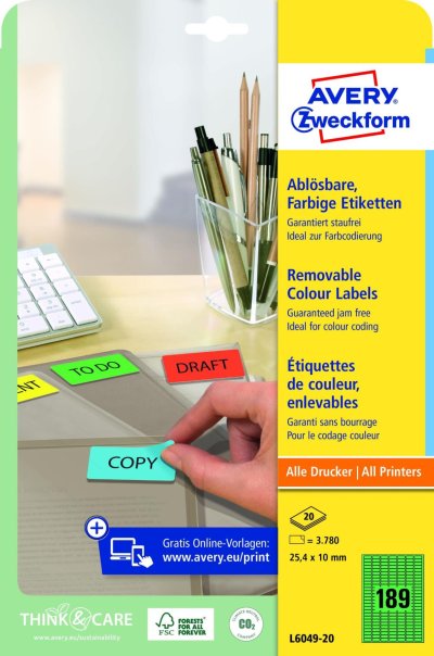 Snímatelné etikety Avery Zweckform zelené barvy - ideální pro barevné rozlišení dokumentů a složek Spolehlivě drží a jsou snímatelné bez zanechání stop po lepidle Bezproblémový průchod etiket tiskárnami …