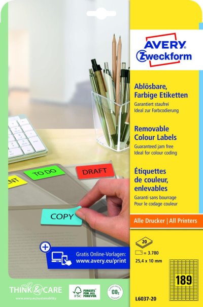 Snímatelné etikety Avery Zweckform žluté barvy - ideální pro barevné rozlišení dokumentů a složek Spolehlivě drží a jsou snímatelné bez zanechání stop po lepidle Bezproblémový průchod etiket tiskárnami …