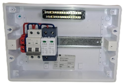 V rozváděči je osazen svodič přepětí DC třídy T1+T2 a dvoupólový DC jistič pro jištění DC vstupu střídače.