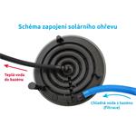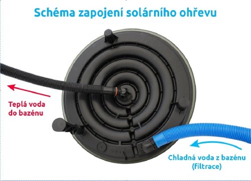 Montáž je opravdu snadná a rychlá. V balení najdete nejen solární ohřev, ale také vrchní kryt z plastu a trny pro napojení na hadice s průměrem 32 a 38 mm. Ohřev umístěte vedle bazénu tak, aby byl ve stejné úrovni s hladinou vody, případně pod ní. Není určený k montáži na střechu.