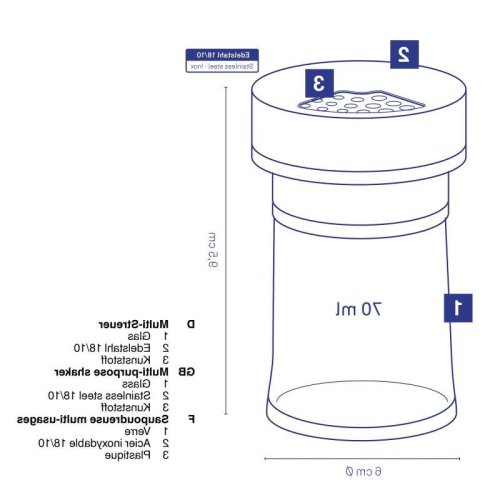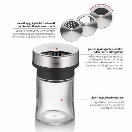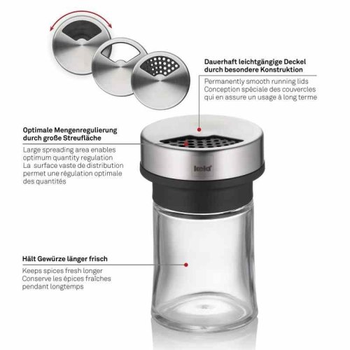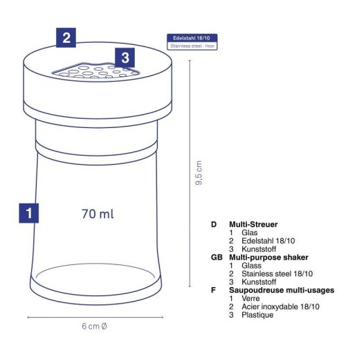 Krásná kořenka Miko: tato kořenka je vyrobena ze skla a má víko z nerezové oceli. Kořenku lze rychle a pohodlně naplnit velkorysým otvorem. Vzhledem k různým variantám otvorů pro rozptyl lze dávkovat a snadno měnit podle potřeby. Kořenka je vysoká 9,5 cm a pojme 70 ml. Sklo, nerez 18/10 6 cm, v. 9,5 cm, 70 ml