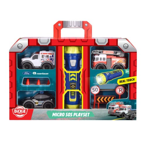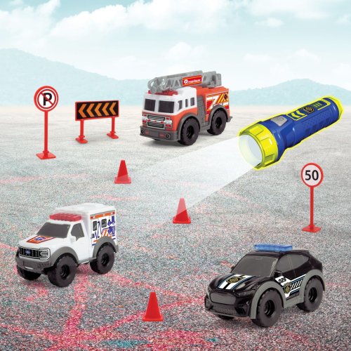 Set 3 ks mini dopravních záchranářských prostředků na volnoběh - hasičské auto, policie a ambulance. Součástí jsou dopravní značky a baterka, která má 3 světelné funkce. Velikost 10 cm.