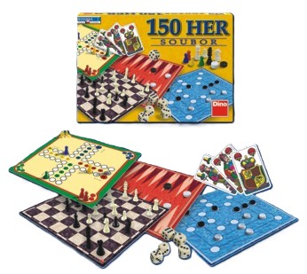 Soubor 150 her. Balení obsahuje 2 herní oboustranné plány, 32 šachových figurek ve 2 barvách, 16 figurek ve 4 barvách, 30 dámových kamenů ve 2 barvách, 6 bodových hracích kostek, 32 jednohlavých mariášových karet, 1 pravidla. Hra je určena pro 2 a více hráčů. Vhodné od 6 let.