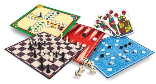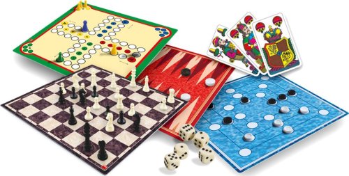 Soubor 150 her. Balení obsahuje 2 herní oboustranné plány, 32 šachových figurek ve 2 barvách, 16 figurek ve 4 barvách, 30 dámových kamenů ve 2 barvách, 6 bodových hracích kostek, 32 jednohlavých mariášových karet, 1 pravidla. Hra je určena pro 2 a více hráčů. Vhodné od 6 let.