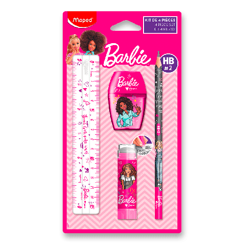 4dílná souprava školních potřeb v atraktivním designu s motivem oblíbené panenky Barbie.