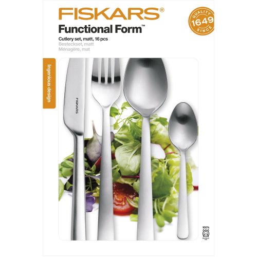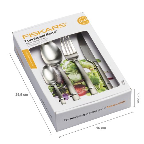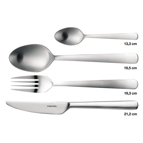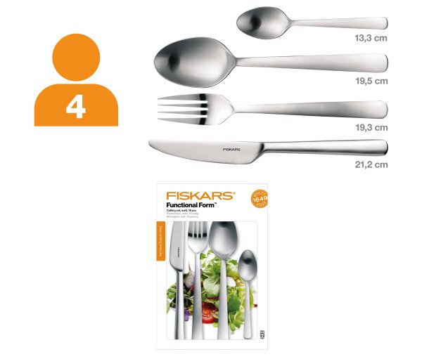 Sada 4 druhů příborů, celkem 16 kusů z vysoce kvalitní nerezové oceli. Lze mýt v myčce na nádobí. Výška: 55 mm, délka: 250 mm, šířka: 165 mm, hmotnost: 978 g.