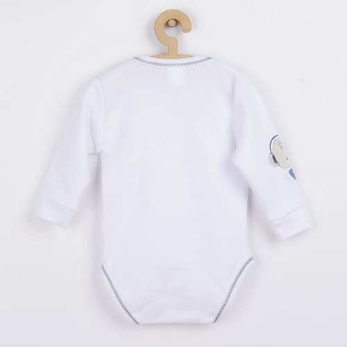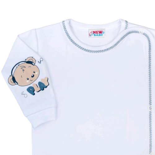 Bavlněná kojenecká 4-dílná soupravička New Baby. Soupravička obsahuje čepičku se zavazování na tkaničky, body s dlouhým rukávem s bočním zapínáním, dupačky a rukavičky. Čepička, body a dupačky mají natištěný veselý obrázek. Barvy použité k potisku jsou certifikované a vhodné pro miminka. Soupravička je vyrobená z příjemného a kvalitního materiálu. Body má praktické zapínání na cvočky po celé délce a mezi nožičkami. Dupačky mají zapínání na cvočky na ramínkách a mezi nožičkami. Složení: 100% bavlna. Rozměry: dupačky - obvod kolem hrudníku 45 cm, délka od ramínek 47 cm, délka od rozkroku cca 16 cm, body - obvod kolem hrudníku 42 cm, délka od ramínek 32 cm, délka rukávu cca 18 cm. Rukavičky 8 cm. Čepička - obvod kolem hlavičky 36 cm.