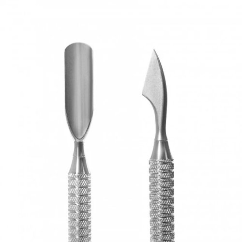 Oboustranná špachtle na manikúru kombinuje široký zaoblený zatlačovač kůžičky s čepelí ve tvaru sekery pro snadné odstranění kůžičky. Obě pracovní části jsou oboustranně broušené a profesionálně ručně naostřené, což zajišťuje maximální přesnost. Díky většímu zatlačovači je nástroj ideální i pro širší nehtové ploténky. Pevná protiskluzová rukojeť umožňuje stabilní úchop a pohodlnou práci při manikúře i pedikúře. Vyrobeno z nerezové oceli AISI 420 s povrchovou úpravou pomocí GOI pasty, která zvyšuje odolnost vůči korozi.
