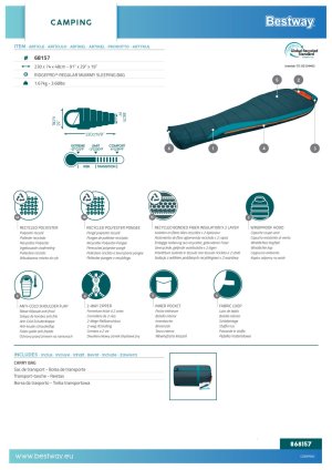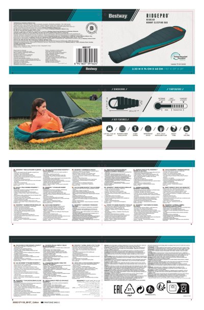 Design spacáku je promyšlený nejen z hlediska funkčnosti, ale i estetiky, kde kontrastní vnitřní a vnější barvy vytvářejí příjemný vizuální efekt. Spací pytel je vhodný pro široké spektrum uživatelů, kteří hledají kombinaci tepelné izolace, pohodlí a udržitelnosti v jednom produktu. Díky certifikaci GRS (Global Recycled Standard) je tento výrobek zárukou ekologicky šetrné produkce, která minimalizuje dopad na životní prostředí. Celkově je Bestway Ridgepro mumie spací pytel vhodný pro všechny, kteří chtějí během svých výletů spát v teple a komfortu, a zároveň dbají na ekologickou odpovědnost.