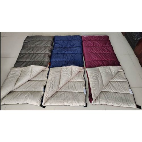 spací pytel dekový 190x75cm, vnější materiál 190t polyester, podšívka tr85x57 100% polyester, výplň 300g/m2, rovné prošití, normální pytel s potiskem a logem, nylonový zip se 2 taháčky, plastový štítek na zipu, čtvercový popruh na suchý zip, vnitřní barva světle šedá, logo na spacím pytli a pytli, pro 0 - +10 stupňů celsia, 3 různé barvy: tmavě červená, modrá a šedá, každá s visačkou a štítkem na šití.