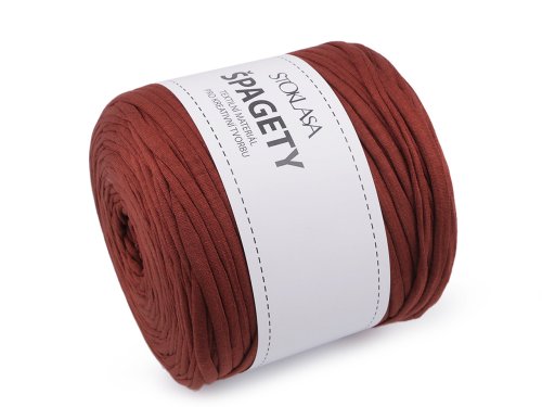 Špagetovou přízi tvoří nařezané proužky látky z recyklované bavlny. Příze je mírně elastická. Využijete ji na pletení a háčkování koberečků, dek, tašek, šál, košíků, batohů, povlaků na polštáře apod. Je příjemná na dotek, vhodná i k pletení rukama. >Velikost jehlic: 9 Velikost háčku: 8 Varianty jsou v základních barvách v různých odstínech (tmavší, světlejší, melírované).