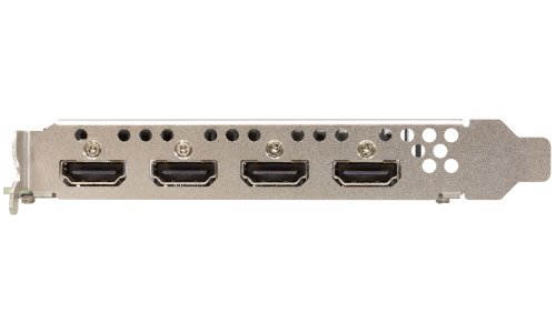 Karta nabízí čtyři HDMI 2.0b porty, které podporují rozlišení až 4096 × 2160 pixelů při obnovovací frekvenci 60 Hz. Tato konfigurace je ideální pro připojení více monitorů současně bez nutnosti použití adaptérů.