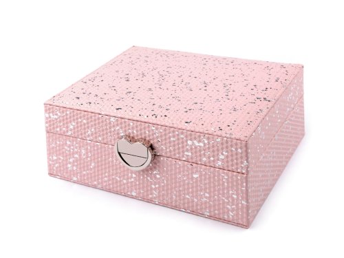 Šperkovnice vás na první pohled nadchne svým zajímavým povrchem se strukturou drobných 3D kostiček a metalickým potiskem. Má velice kvalitní a precizní provedení. Ochrání vaše šperky před nepříznivými vlivy okolí, jako je světlo nebo vlhkost. Součástí šperkovnice je kovové zapínání ve tvaru srdce. Uvnitř je 6 přihrádek, 2 polštářky na brože, hodinky či náramky, 2 oddíly na prsteny, přepážka na puzetové náušnice, kapsa, zrcátko a 6 háčků na zavěšení.