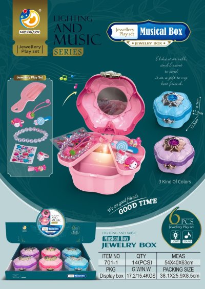 Tato šperkovnice se světelným a zvukovým efektem je ideální pro malé parádnice, které mají rády krásné doplňky! Šperkovnice se otevírá a při tom vydává světelné a zvukové efekty, což přidává na kouzlu a zábavě. Set obsahuje hřebínek, gumičku, sponku a další doplňky, které jsou skvělé pro úpravu vlásků a vytvoření různých účesů. Perfektní pro děti, které si rády hrají na krásu a péči o vzhled, a zároveň si užívají kouzelný zážitek z otvírání šperkovnice!