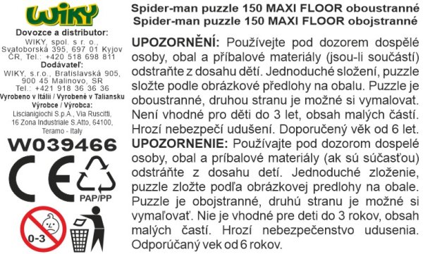 Spider-man Puzzle MAXI-FLOOR oboustranné. Rozměry složeného obrázku 70x50 cm. Balení obsahuje 150 dílků. Jedna strana je potisknutá barevně, druhá je určena k vymalování.