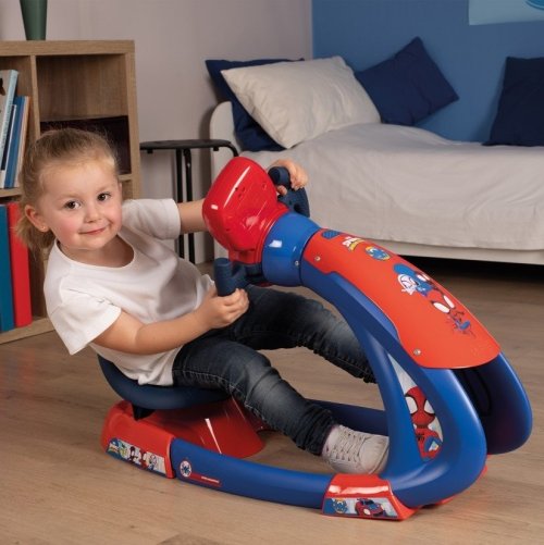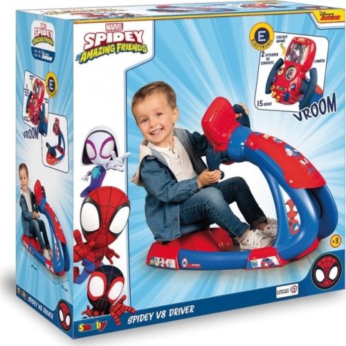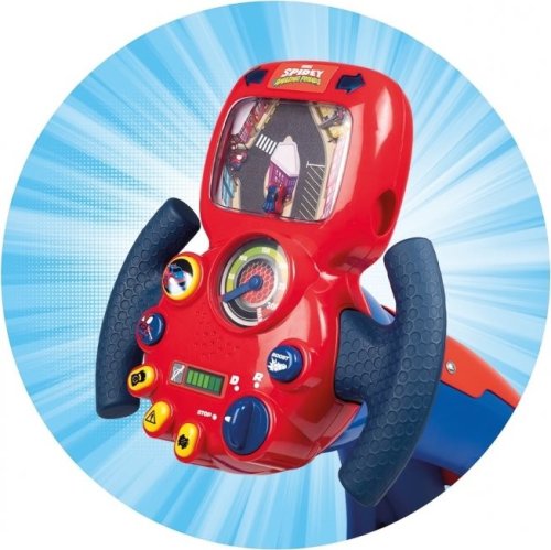 Trenažér pro malé řidiče s motivem Spideyho a jeho kamarád- Pohodlná a nastavitelná sedačka - 3 polohy, mechanické pedály, elektronický volant s rolovací mapou, podsvícení displeje, 15 zvuků aut a Spideyho webu, funkce boost, zpátečka. Rozměry: 85 x 50 x 36 cm. Hmotnost 2,55 kg. Max. nosnost 50 kg.