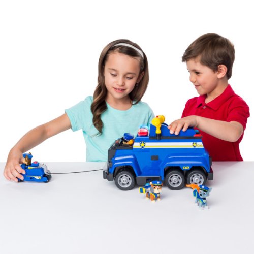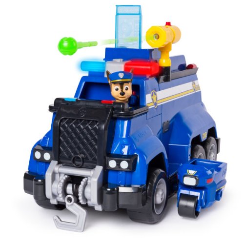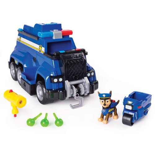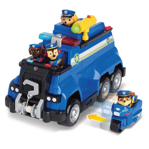 Velké policejní auto Chase s originální motorkou. Auto vydává zvuky a blikají mu houkačky. Funkční naviják jej dostane z potíží. Vejdou se do něj všechny štěňátka s Paw Patrol.