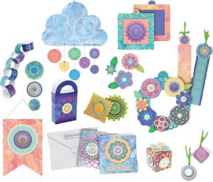 Obsah balení: 12 listů šablon, 5 přání s obálkami, jmenovky na dárky, lepicí magnety, rámečky s podložkami, samolepky, stuha, provázky, oboustranné lepicí pěnové čtverce a podrobný návod.