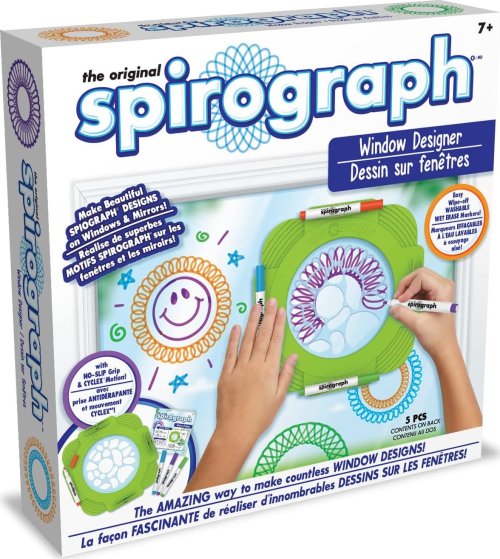 Díky novému Spirographu si můžete vyzdobit okna přesně podle svých představ! Stačí přiložit spirograph k oknu a použít fixy smazatelné vodou nebo použijte fantazii a kreslete vzory volně rukou. Trocha vody a hadřík vyčistí okno, takže můžete navrhovat znovu a znovu! Balení obsahuje: