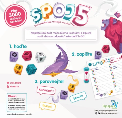 Najdete za 3 minuty 10 spojení mezi 5 kostkami z různých tematických skupin? Zkuste se trefit do stejné odpovědi, jakou zvolili ostatní hráči. Ve hře najdete 10 kostech v pěti barvách. Pro každou hru použijete jednu kostku od každé barvy. Celkem hra nabízí více než 3000 různých kombinací. VODA a MASOŽRAVEC? To by mohl být žralok. ČÁST TĚLA a OVOCE? Co třeba ohryzek? I důmyslné odpovědi se počítají!