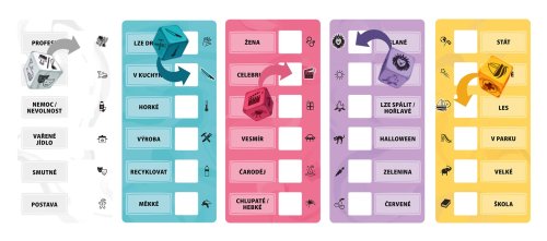 Obsah balení: 10 kostek 10 šablon s klíčovými slovy 1 poznámkový blok 1 přesýpací hodiny 1 česká pravidla