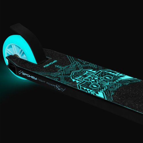 Freestyle koloběžka Spokey Night Rider je ideální volbou pro začínající a středně pokročilé jezdce. Vyznačuje se zesílenou konstrukcí a zároveň nízkou hmotností. Protiskluzová nášlapná deska s fosforeskujícím povrchem, který svítí ve tmě, zajišťuje nejen styl, ale i lepší viditelnost při jízdě.