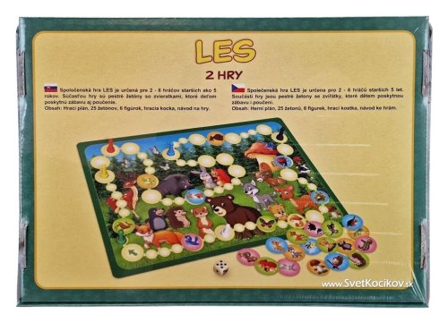 Společenská hra LES je určena pro 2 - 6 hráčů starších 5 let. součástí hry jsou pestré žetony se zvířátky, které dětem poskytnou zábavu i poučení. Obsah je herní plán, 25 žetonů, 6 figurek, hrací kostka a návod ke hrám.