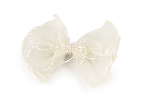 Velká spona s textilní mašlí nádherně ozdobí účes na všední den i slavnostní událost. Mašle je elegantní, ozdobená perlovým řetízkem. Je ušitá z vrapované monofilové stuhy s jemným třpytem, díky všitého silonu perfektně drží tvar. Spona má kvalitní celokovové provedení, ve vlasech pevně drží díky zoubkům.