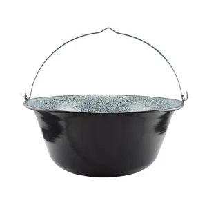 Smaltovaný klasický tábornický kotlík vně černý, uvnitř černobílý prsk.