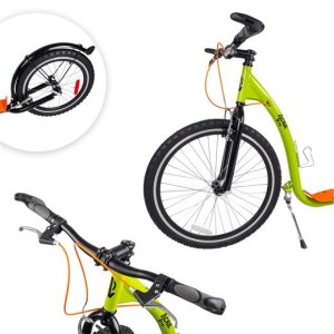 Koloběžka s nosností 120 kg, doporučená výška jezdce až 190 cm, pro děti od 14 let, přední kolo 26", zadní kolo 20", kvalitní odlehčená ocel, přední i zadní V-Brzdy, gumové rukojeti.