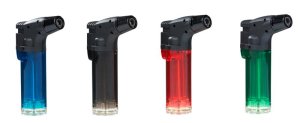 Zapalovač piezo Turbo. Klasický tvar zapalovače se sklápěcím zapalováním.