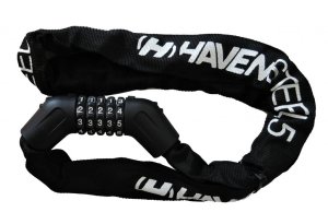 Numerický (5 číslic) zámek na kolo potažený textilním obalem zabraňujícím poškrábání rámu kola a snadnější uchycení.