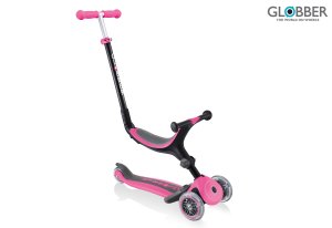 Globber Koloběžka Go Up Foldable Plus Sky Pink Vše v jednom - koloběžka pro batolata se sedátkem s patentovaným, přizpůsobivým designem se mění z režimu pro děti na jízdu vsedě s rukojetí pro rodiče, …