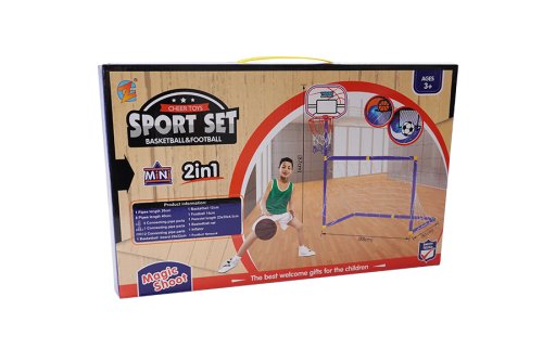 Fotbal nebo basketbal? Sada, která obsahuje náčiní pro obě hry. Vyber si, co si chceš zahrát. Rozměr branky 55x88xx45 cm, výška koše 87 cm, průměr míče na fotbal 14 cm a průměr míče na basketbal 12 cm. V sadě je pumpička na nafouknutí míčků.