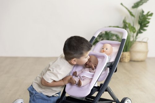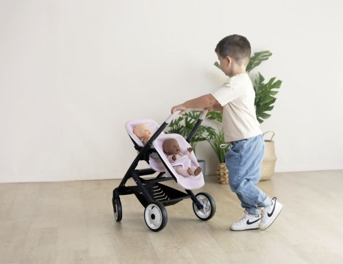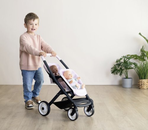 Dvojitý kočárek Smoby s odnímatelnými sedadly a tichými kolečky. Moderní sportovní kočárek pro panenky Smoby twin v nezaměnitelném designu Quinny. Dobře navržený kočárek pro panenky má skvělé vlastnosti: ergonomická rukojeť pro snadné uchopení je obzvláště pohodlná do malých dětských rukou, potahy sedadel z robustní tkaniny ze syntetických vláken se snadno čistí - stačí otřít vlhkou houbou. Přední sedadlo je vybaveno bezpečnostním pásem. Vhodné pro panenky do 42 cm. Dodání bez panenky. Rozměry produktu (DxŠxV): 54,5 x 38,5 x 64 cm.