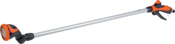 Sprchová postřikovací tryska na prodloužené hliníkové rukojeti s ohebnou hadicí umožňuje nastavení rozstřiku a dosažení i vzdálenějších míst. Otočná o 180 st. Délka: 95 cm.