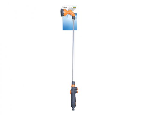Zahradní sprcha s devíti polohami, plastovou hlavicí a koncovkou. Délka kovové tyče: 90 cm. Barva: černo oranžová.