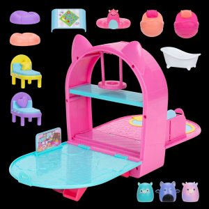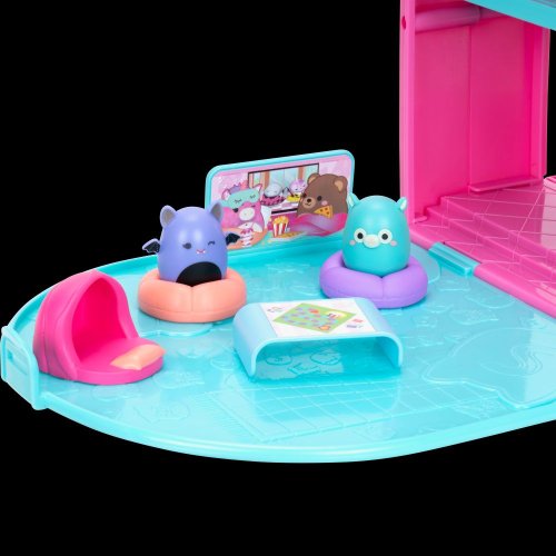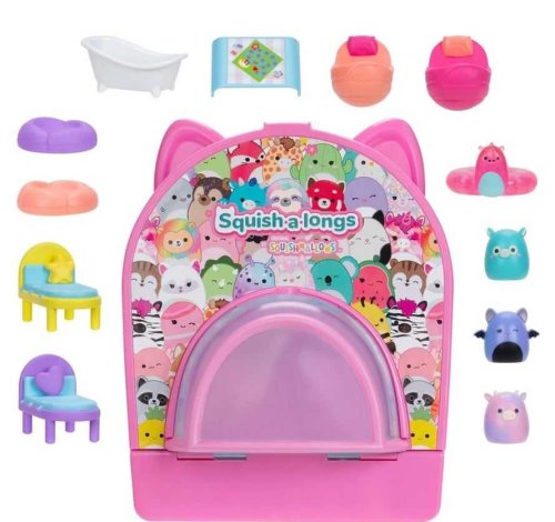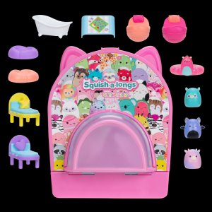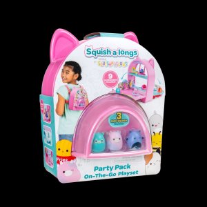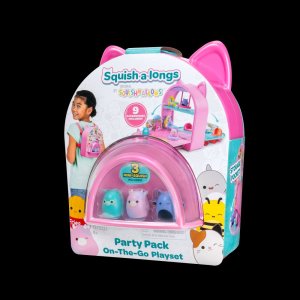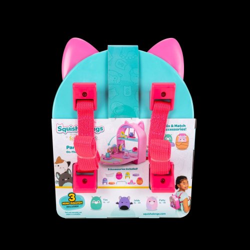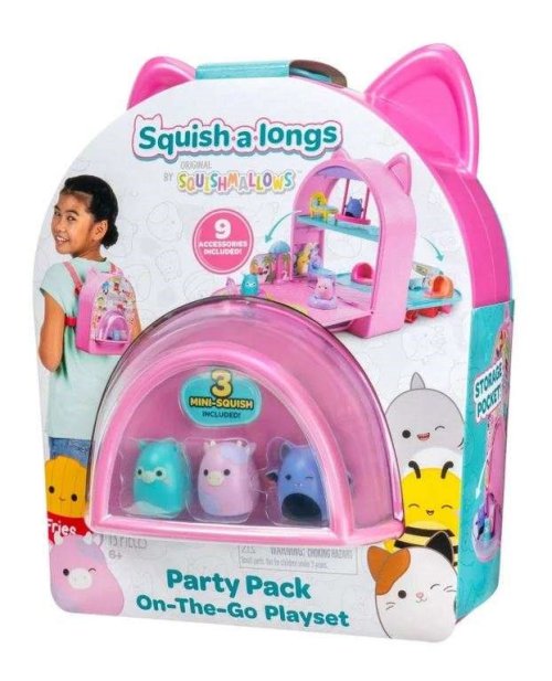 Představujeme Squish-a-longs, vaše oblíbené Squishmallows ve zcela nové velikosti 2,5 cm! Mini-Squish jsou velmi sběratelské, přeměňují se na zázraky, které můžete nosit a jsou ideální na cesty. Hrací sada Party Pack On-the-Go je batoh s nastavitelnými popruhy a přední úložnou kapsou, který se promění v úžasné místo na párty