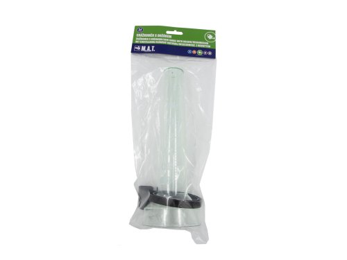 Srážkoměr s držákem, který umožňuje přímý odečet úhrnu srážek ze stupnice vylisované na samotném srážkoměru.